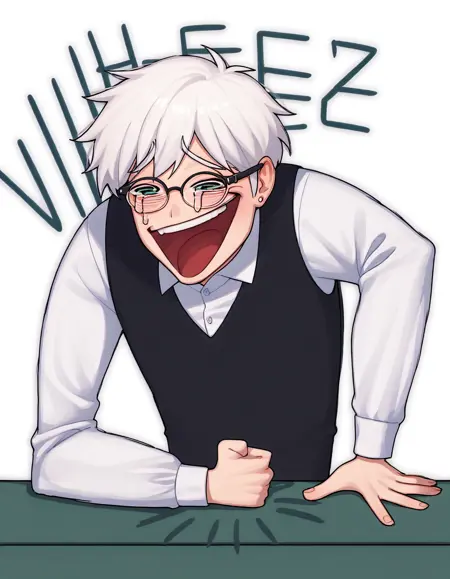 Promt: 1 male sits at an angle on a desk in the classroom, smile, looking at viewer, green eyes, glasses, white shirt, black vest, black trousers, white hair lora:Anton\_Petrov:0.8