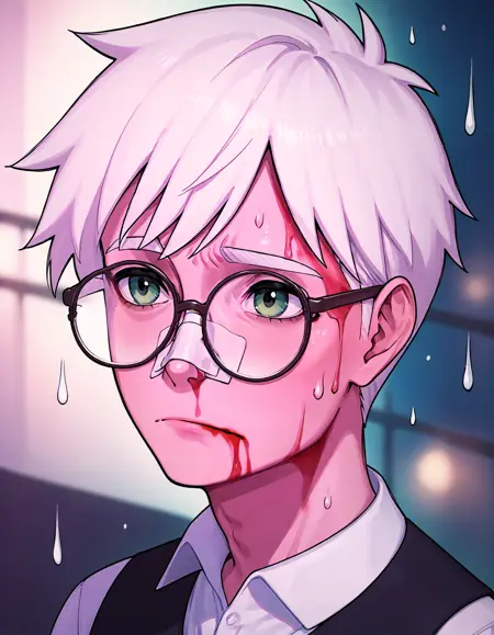 Promt: Anton_Petrov, solo, green eyes, white hair, long sleeves, white shirt, black vest, glasses, black shirt.