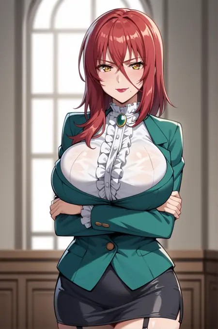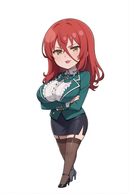 緑のジャケット、白いシャツ、フリル、ボタン、ロングスリーブ、ブローチ、黒いスカート、ペンシルスカート、ガーターストラップ、黒い大腿ハイ、黒い靴、ハイヒール