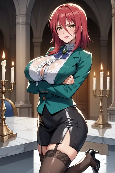 녹색 재킷, 흰 셔츠, 프릴, 단추, 긴 소매, 브로치, 검은 치마, 연필 치마, 스타킹 고정대, 검은 허벅지양말, 검은 신발, 하이힐