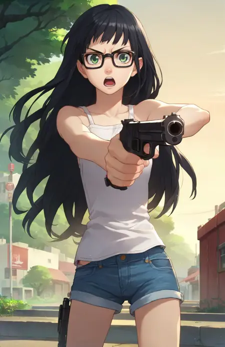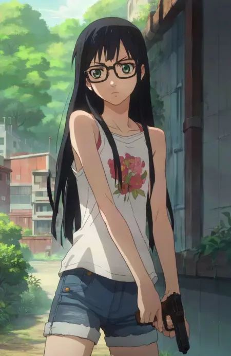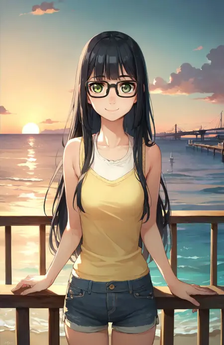 lora:AoiFutaba:0.8 aoifutaba, 1girl, long hair, black hair, green eyes, glasses, shorts