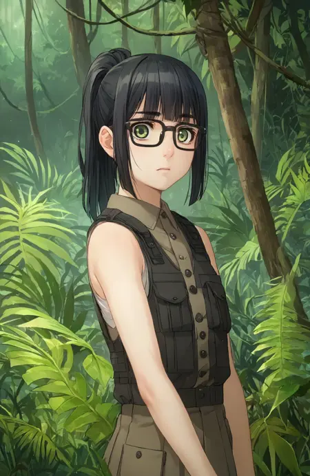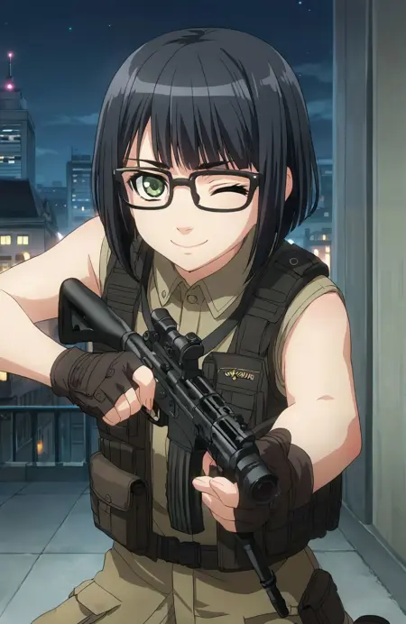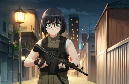 プロンプト: aoifutaba, military uniform, 1girl, smile, short hair, black hair, gloves, green eyes, glasses, fingerless gloves, load bearing vest