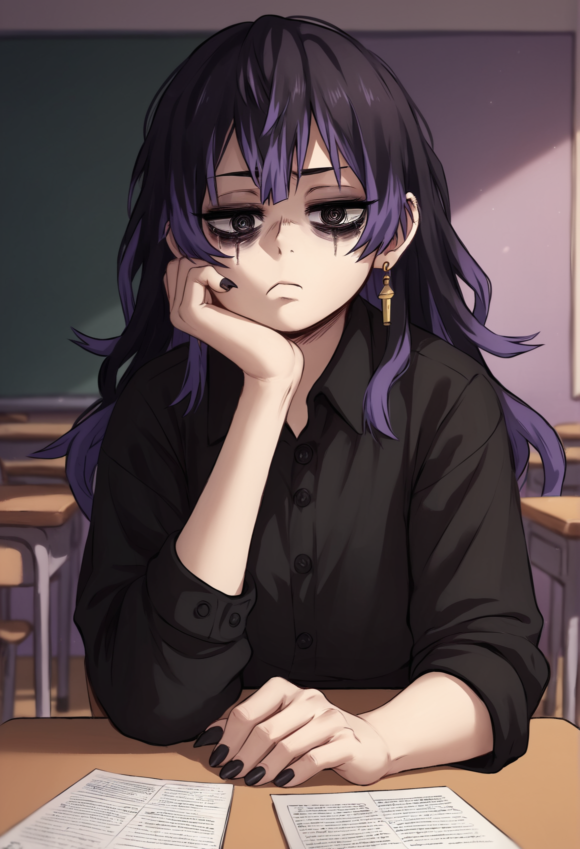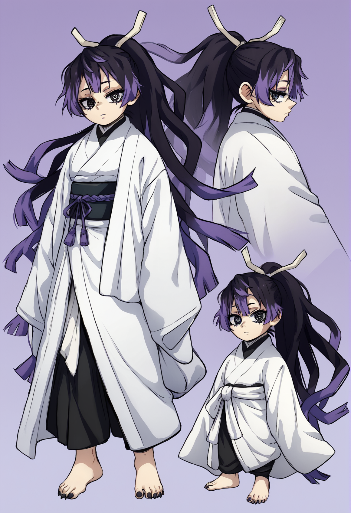 Clothes prompts are (they can easily be changed) : purple mantle, oversized clothes, floral print, layered clothes, black kimono, sleeves past fingers