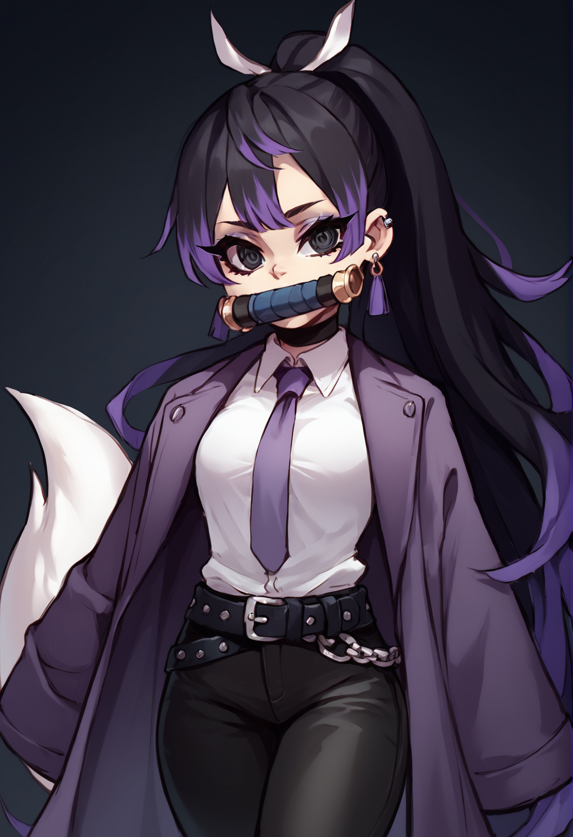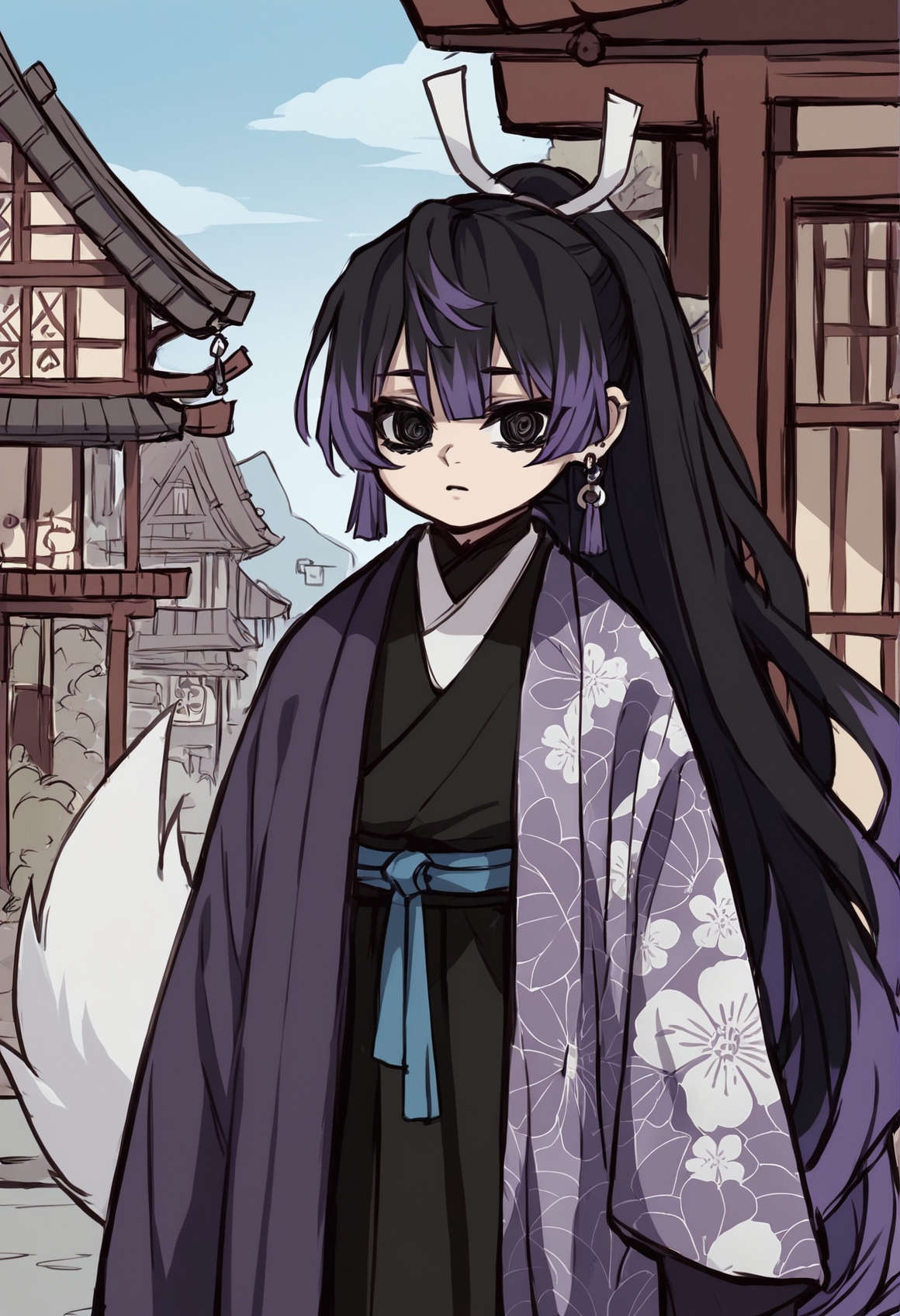 Prompts are : FoxDemon, 1girl, black hair, two-tone hair, ponytail, black eyes, earring