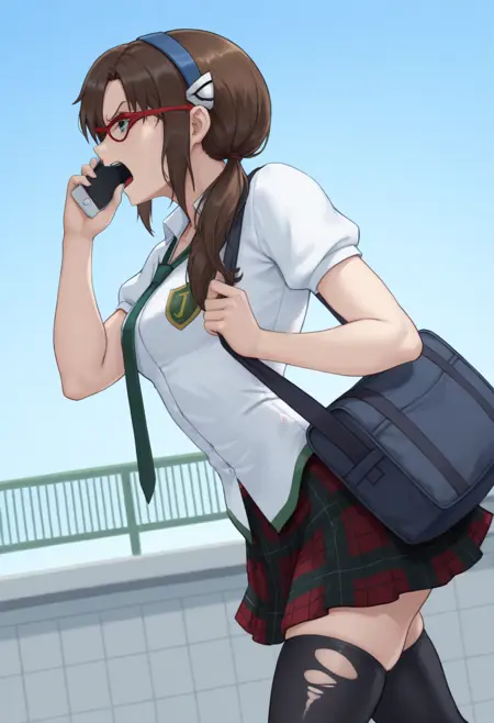 触发词:“mari-pink, red-framed eyewear, hairband, pink plugsuit,”