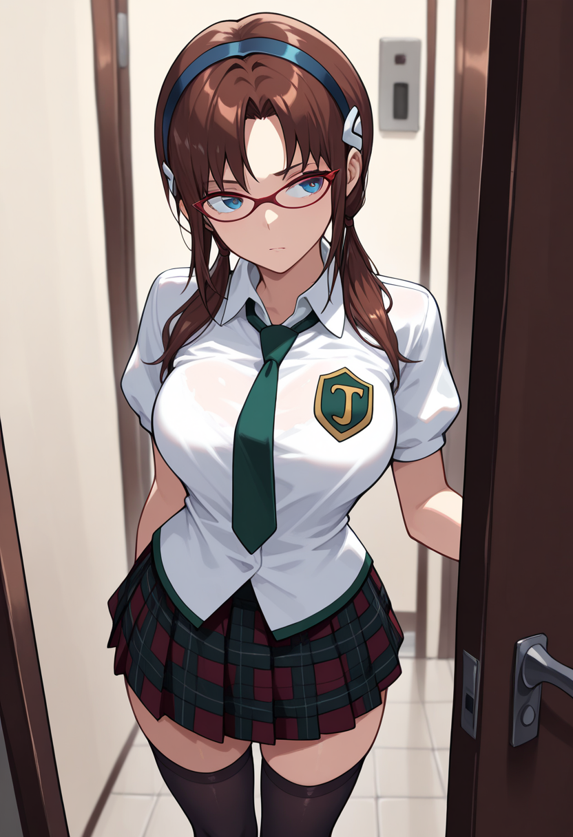 服装标签:“untucked shirt, green necktie, plaid skirt, thighhighs, loafers”