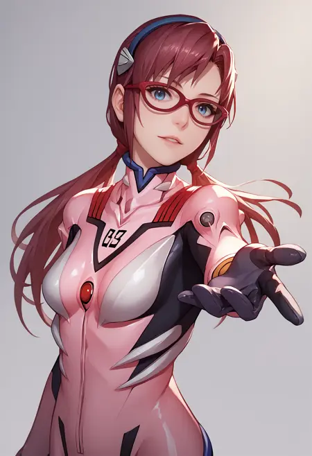 Trigger word "mari-pink, red-framed eyewear, hairband, pink plugsuit,"