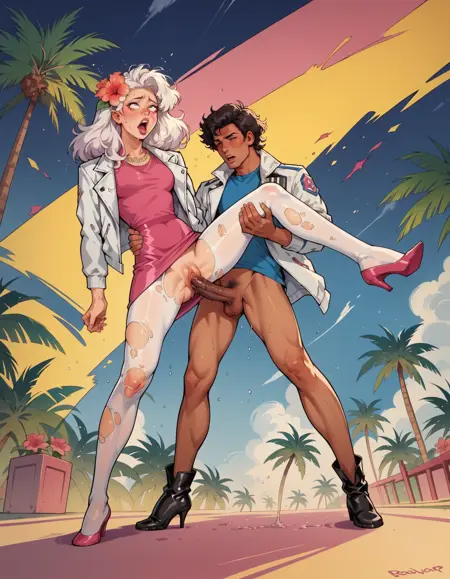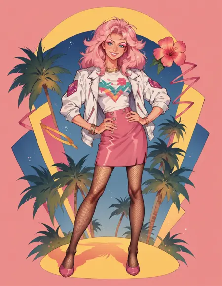 일반 키워드: hud_jem_boxart, 화려한 레트로 아트 스타일, 화려한 배경, 야자수, 1girl, 긴 머리, 재킷, 꽃, 셔츠, 스커트, 팬티하이즈, 하이힐, 립스틱, 중간 크기의 가슴, 보석