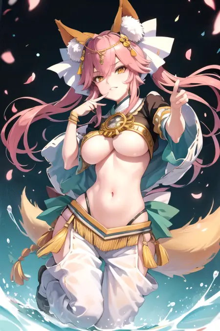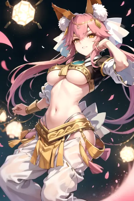 AmaterasuFate, 1girl, solo, long hair, large breasts, navel, fox ears, twintails, jewelry, hair ribbon, yellow eyes, pink hair, hair bow, midriff, underboob, dancer, tamamo (fate),