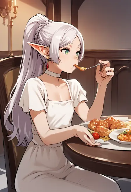 異なる衣装を付けたい場合は、「フリーレン」「エルフ」のみを使用してください。このLoRAは非常に漏れやすいので、より詳細なトークンを追加することをお勧めします。ドレスの際には、よく漏れるため「ツインテール」を必ず追加してください。