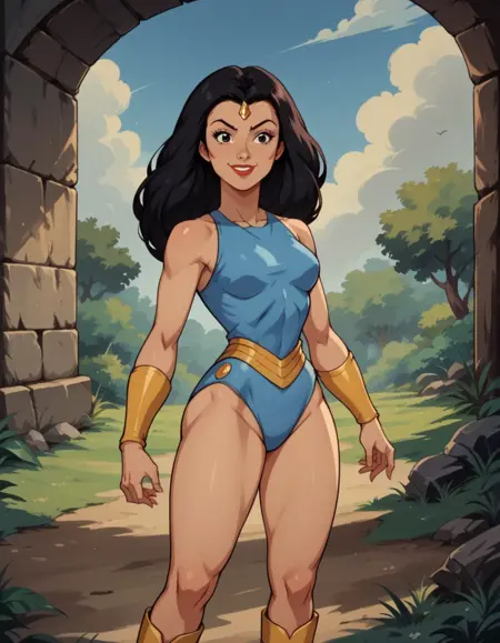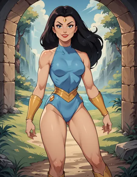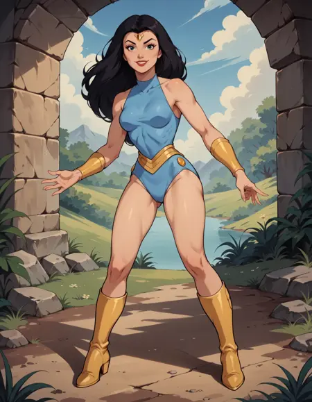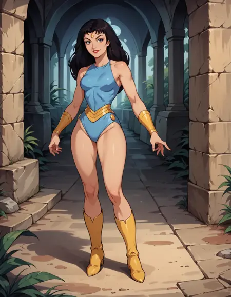 hud_thundarr_ariel, 1girl, solo, 青いレオタード, 黄色のブーツ, 額のジュエリー, ブレイサー, リップスティック, レトロアートスタイル, 1980年代(スタイル)