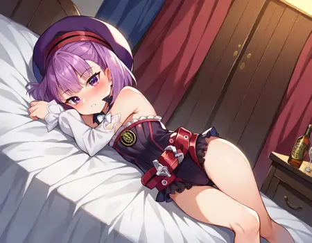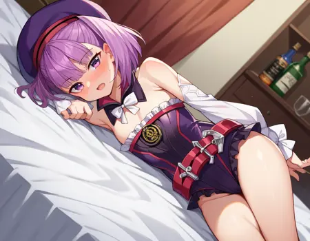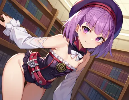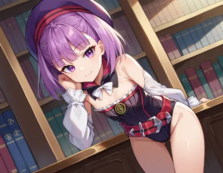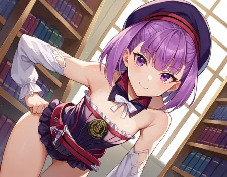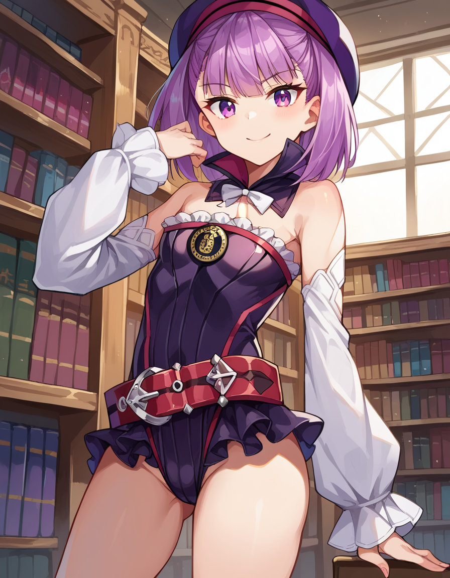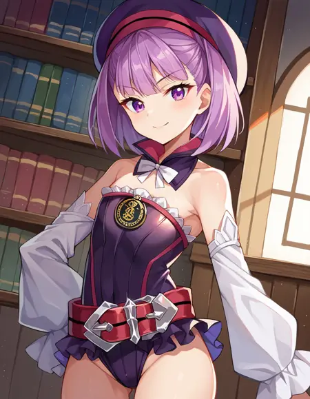 어깨 노출, 벨트, 베레모, 리본, 분리형 칼라, 분리형 소매, 모자, 레오타드, 보라색 머리장식, 보라색 레오타드, 빨간 벨트, 하얀 리본, 하얀 소매,