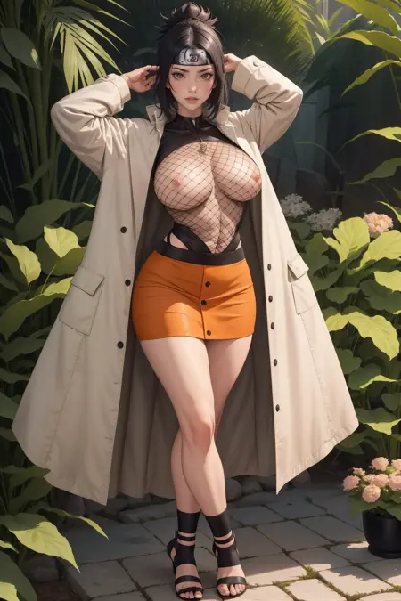 앉아 있음, 다리 벌림, (전신), (최고 품질, 걸작:1.2), 초세밀, anko_mitarashi, 이마 보호대, 스파이크 헤어, 나루토 헤드뱅, 1소녀, 가슴, 싱글, 피쉬넷, 큰 가슴, 피쉬넷 상의, 바디수트, 보석, 코트, 입술, 벌어진 코트, 벌어진 옷, 앞머리, 피쉬넷 바디수트, (정원, 꽃), 주황 치마, 하이힐 신발, 검정 스타킹