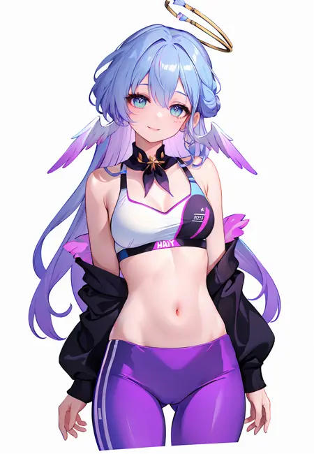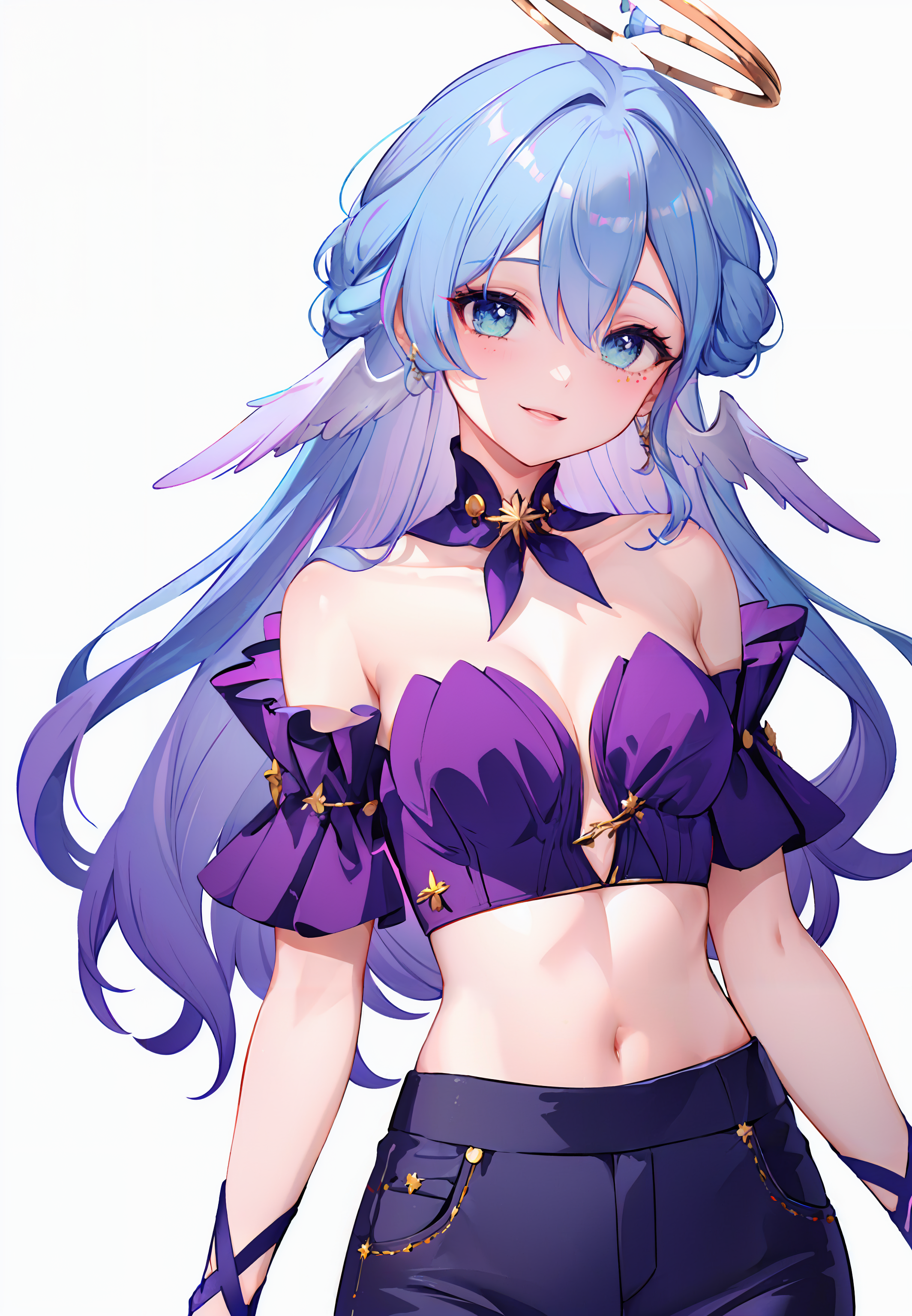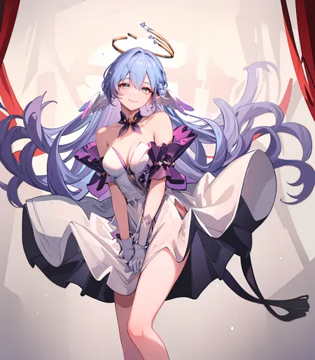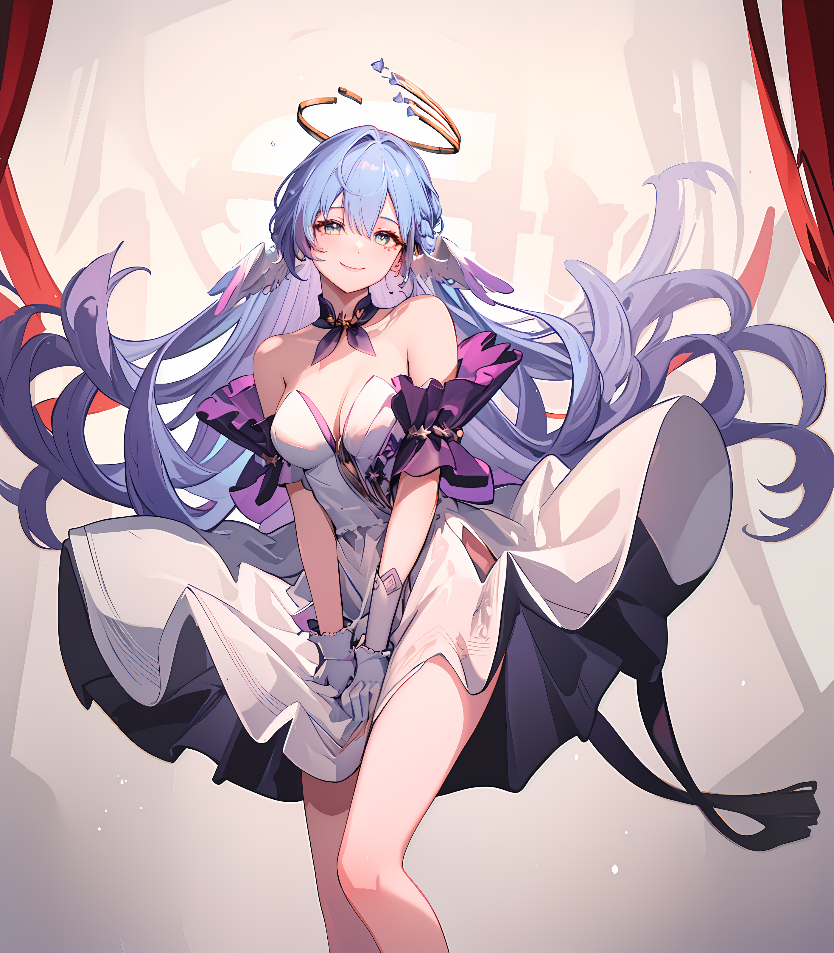 罗宾(HSR 音乐会广告 CM: “演出开始前”)(仅 SDXL 版本): robincm, halo, head wings, 蓝色手套, 珍珠手链, 白色高跟鞋, 丝带