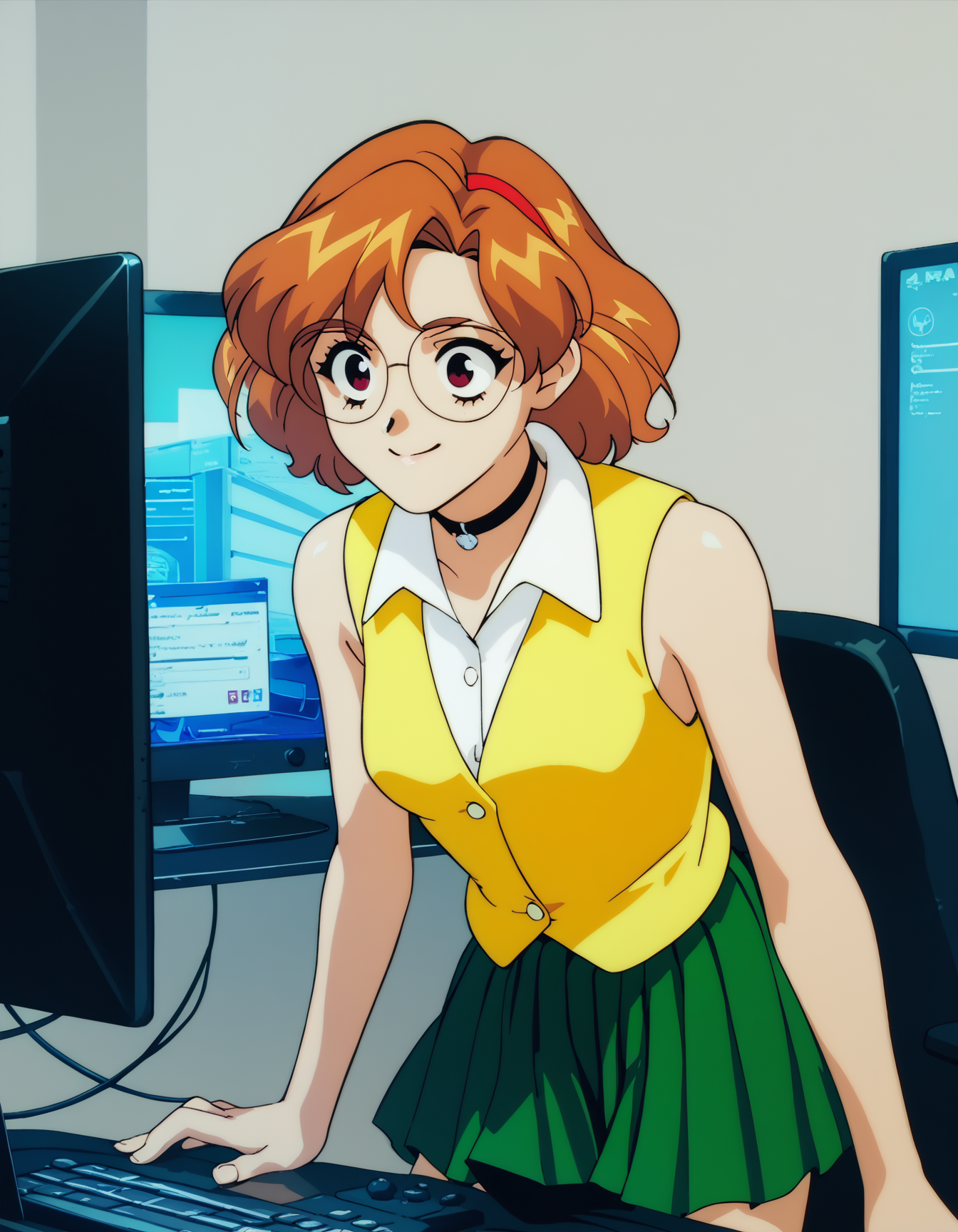 노란 조끼: 초커, 소매 없는 조끼, 노란 조끼, 벌거벗은 팔, 주름치마, 녹색 치마