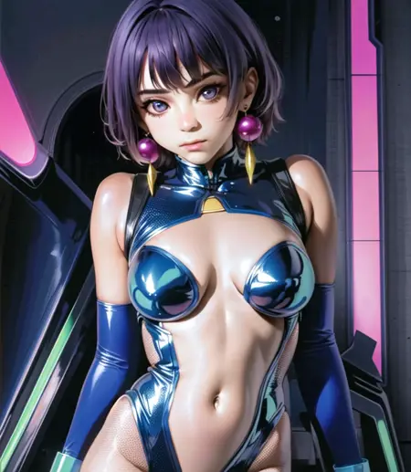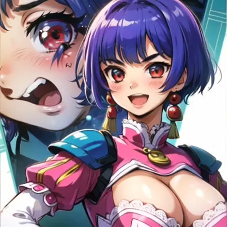 더 정확하게: 짧은 머리, 앞머리, 빨간 눈, 보석, 보라색 머리, 귀걸이, 네일 프로텍션, 메이크업, 립스틱, 보라색 한복