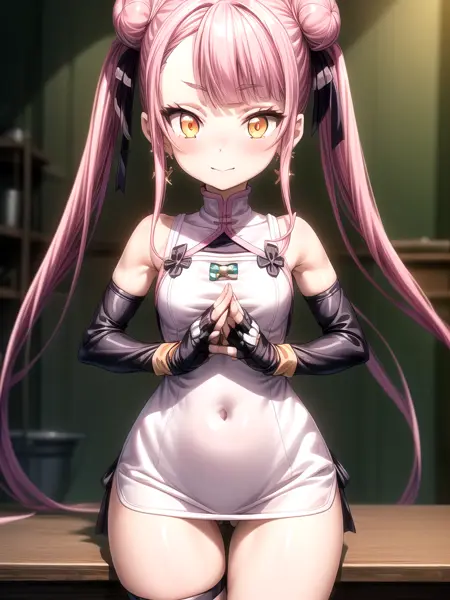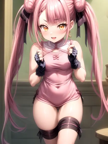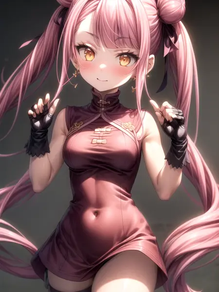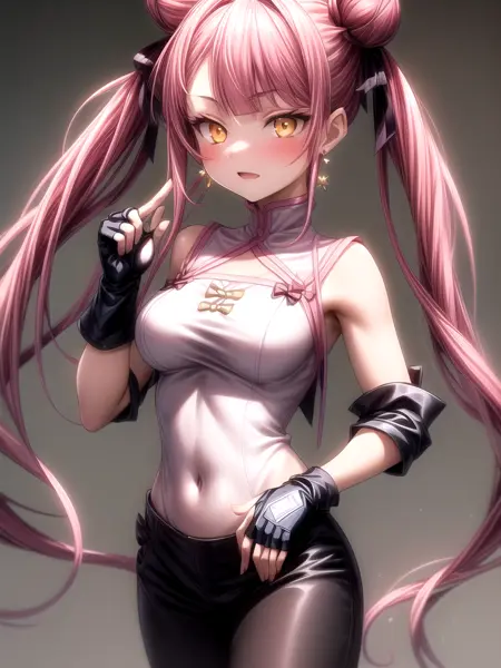 プロンプト:masterpiece, best quality, high quality, 1girl, solo, teen, orange-gold eyes, pink hair, double buns hairstyle, twintails, blunt bangs, (hip-length hair tendrils), unique cut style, unique hairstyle, pale skin, slim body, two hair ribbons, bow dangle earrings, fingerless gloves, full-size, <lora:Tao Yuifa:0.8>