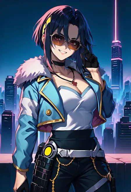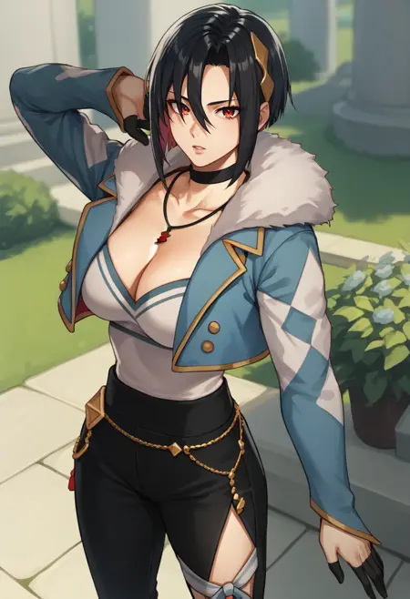 Somniel 옷차림: casNel, 단발, 눈 사이의 머리카락, 가슴 부분 절개, 큰 가슴, 보석, 검은 장갑, 초커, 목걸이, 검은 초커, 검은 바지, 파란색 재킷, 짧은 재킷, 긴 소매, 털 장식이 있는 재킷, 반장갑, 옷 절개부