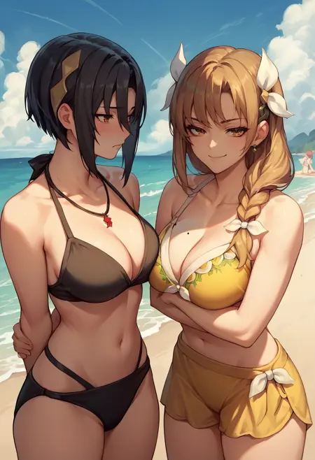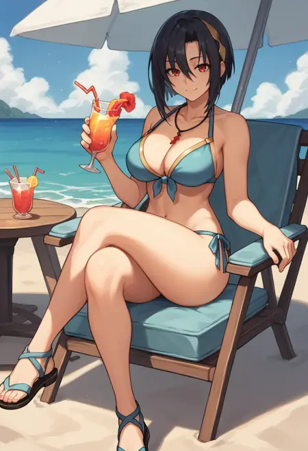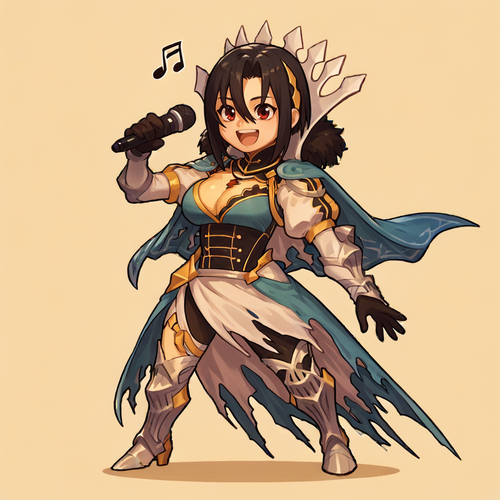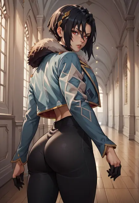 기본 외모: defNel, 눈 사이의 머리카락, 단발, 가슴 부분 절개, 큰 가슴, 높은 칼라, 머리 장식, 목걸이, 비대칭 옷, 털 장식이 있는 작은 망토, 팔 보호대, 장갑, 풍성한 소매, 목걸이, 갑옷 부츠, 한쪽 다리만 덮는 바지