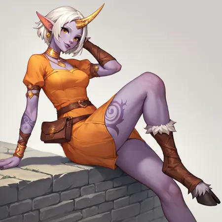 score_9, score_8_up, score_7_up, source_anime lora:SorakaXL:1 soraka (wild rift), soraka, 보라색 피부, 보라색 문신, 뾰족한 귀, 긴 흰 머리, 노란 뿔, 노란 눈, 발굽, 염소 발굽, 벨트, 보석, 달모양 지팡이, 주황색 셔츠/드레스