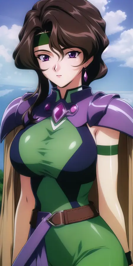 - green_sleeveless_bodysuit_brown_capelet_pauldrons_green_headband_wristband_arm_strap_gem_belt: Her classic outfit.
