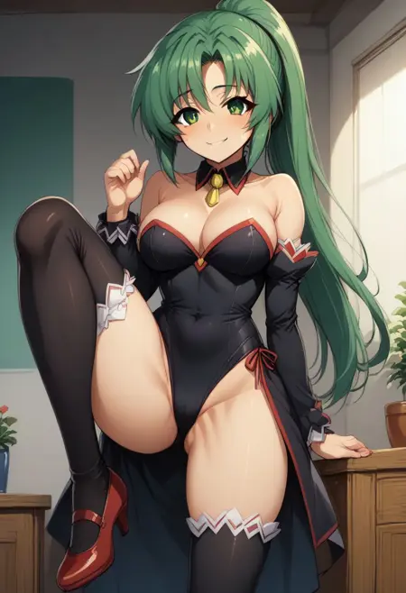 | 학습된 단어 | Angel mort, waitress, uniform, black thighigh, black leotard, black sleeves, detached sleeves, detached collar, collarbone, cleavage, showgirl skirt, bare shoulders, frills, high heels, lace-trimmed dress, black dress, strapless leotard, high heels, covered navel, red footwear, strapless dress, juliet sleeves, cross-laced footwear, red ribbon, frilled thighhighs, lace, sidelocks, zettai ryouiki, lace trim, bow, 복사됨! |