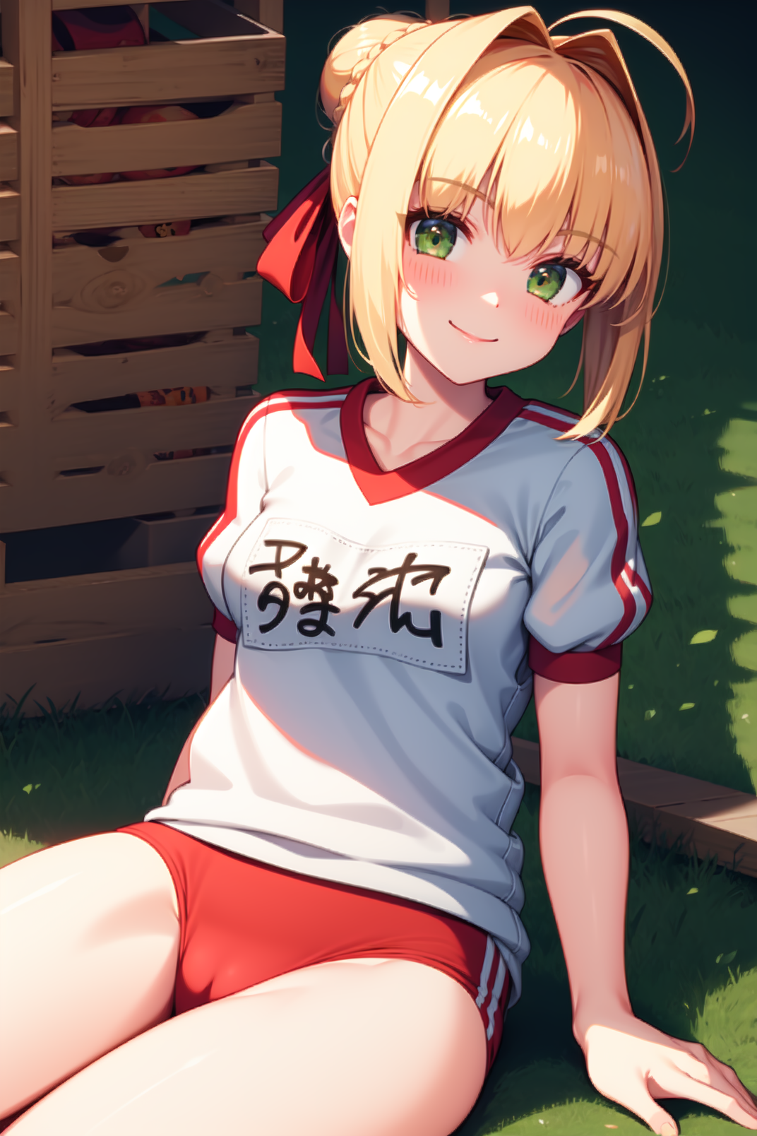 외모: 네로, 녹색 눈, 금발, 측면 머리카락, 아호게, 단일 머리카락 단, 프랑스 땋기, 빨간 머리 리본