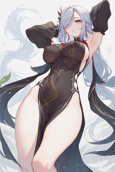 プロンプト:shenhe (lenghuayoulu), black china dress, white underwear, alternate costume, shenhe (genshin impact), detached sleeves
