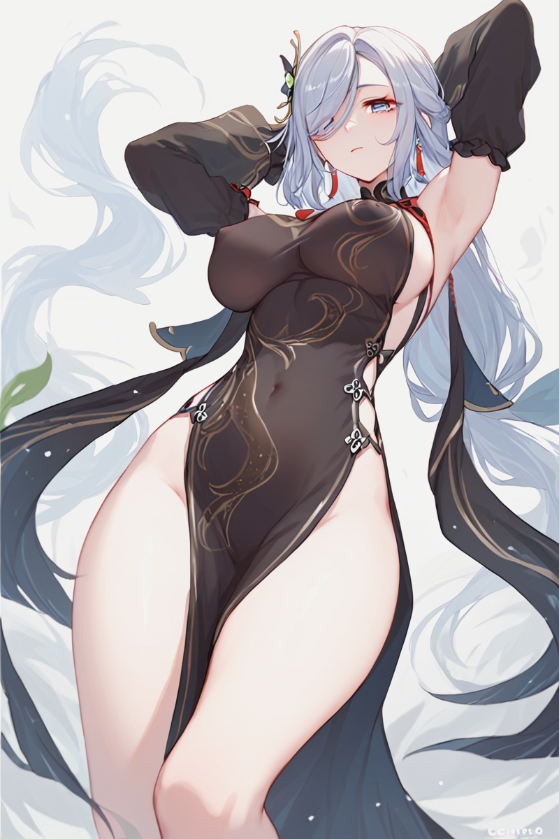提示词:shenhe (lenghuayoulu), black china dress, white underwear, alternate costume, shenhe (genshin impact), detached sleeves
