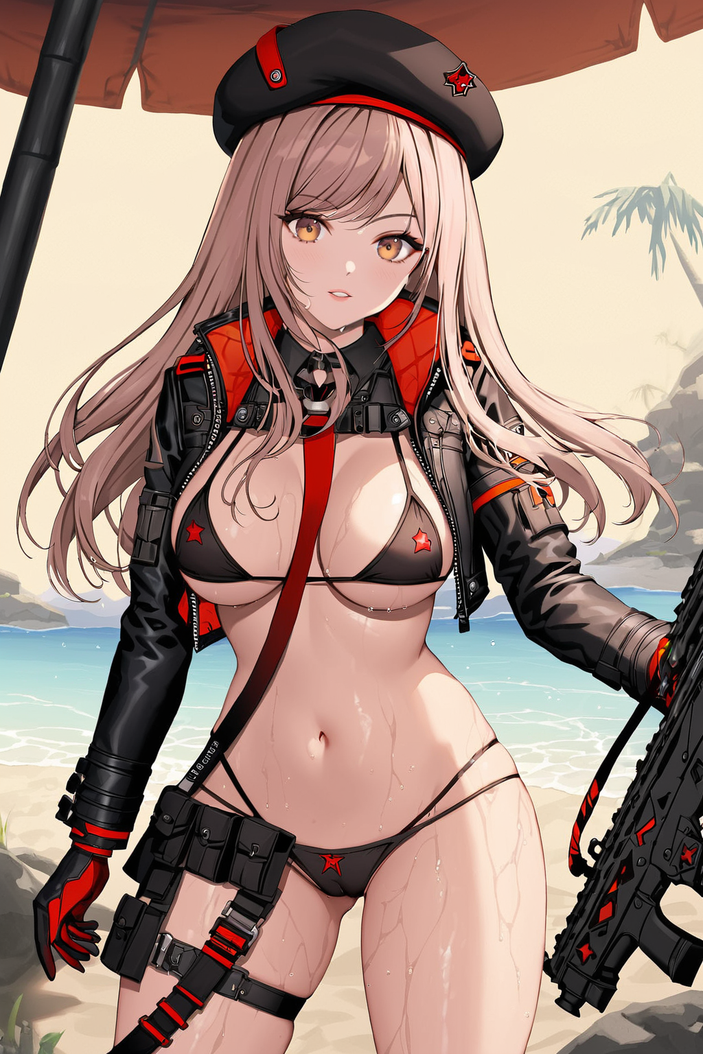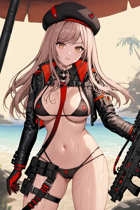 夏季服装:武器,拉皮,1个女孩,手套,贝雷帽,湿透的内裤,比基尼,西部镜头,回眸,臀部,NSFW,乳房,
