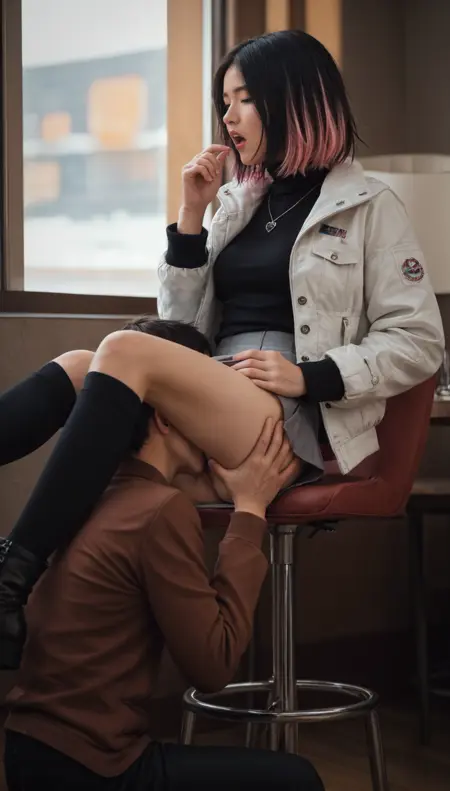 hand on another's head, ass, anilingus, spread legs, sitting on face, clothes lift, full body, from above, from below, from front, from side, open mouth, closed eyes, tongue, tongue out, oral, pubic hair, pussy juice, pussy cum