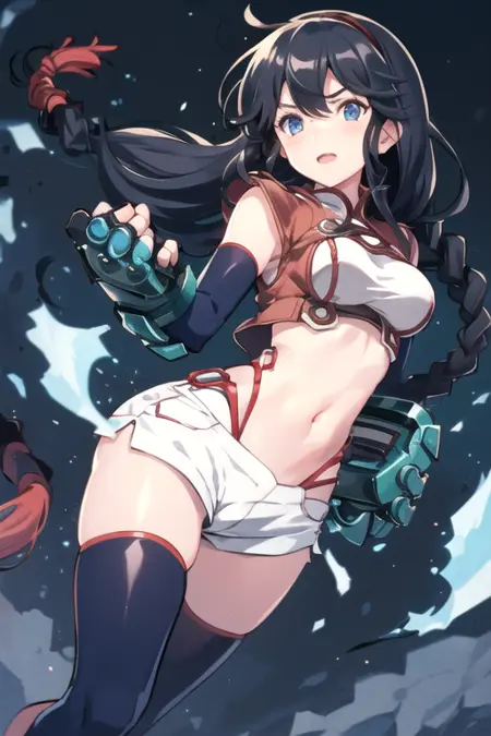 | 학습된 단어 | KanamiLogHorizon, 1girl, solo, very long hair, blue eyes, black hair, blue thighhighs, elbow gloves, navel, medium breasts,single braid, hairband, short shorts, midriff, fingerless gloves, highleg panties, gauntlets, white shorts, blue gloves, 복사됨! |