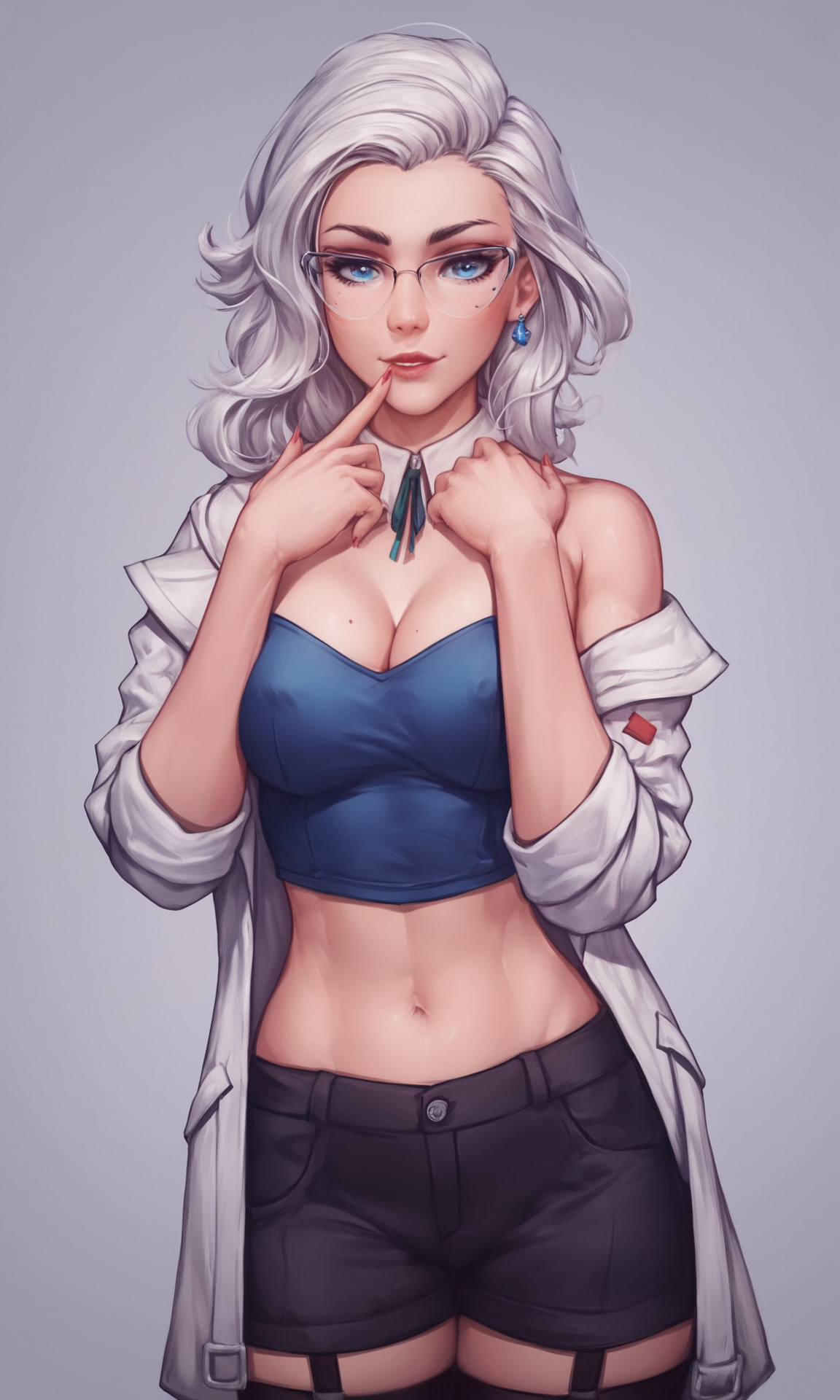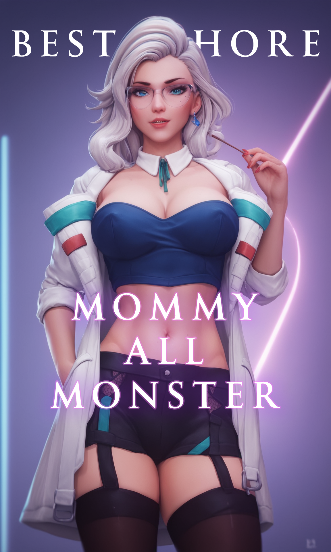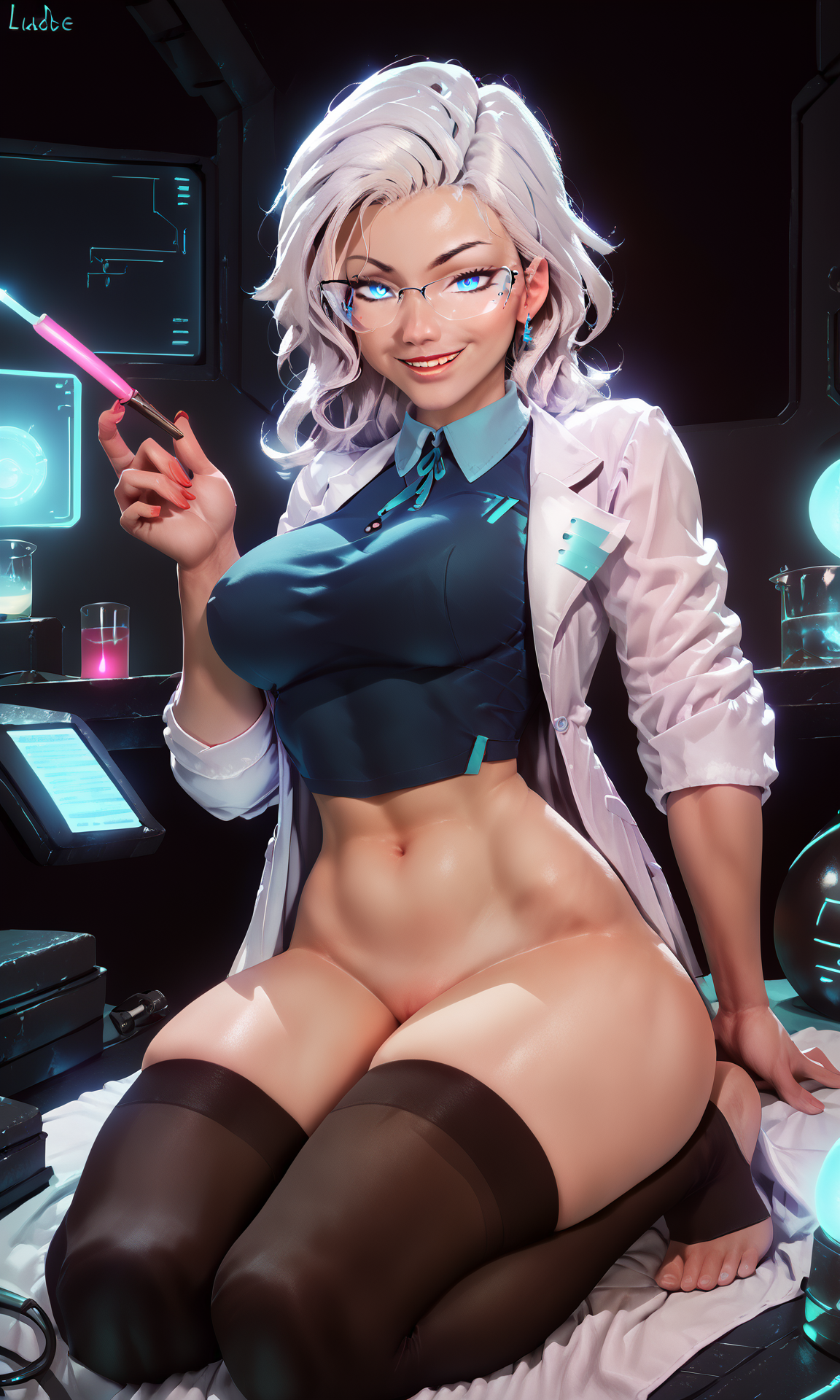可选:“labcoat, black stockings, glowing eyes