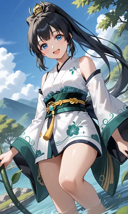 Hotarugusa, black hair, ponytail, hair ornament, blue eyes, japanese clothes, white kimono, detached sleeves, wide sleeves, bare shoulder, single thigh high, white thigh high on left leg, vine wrapping right legs, black toeless legwears, green obi and sash
