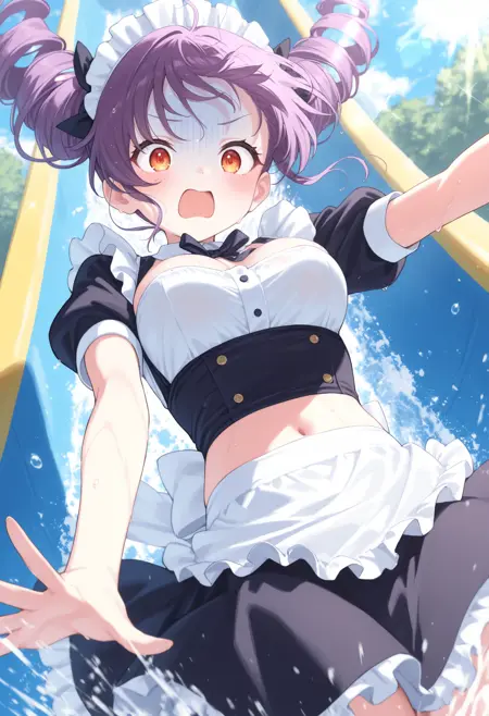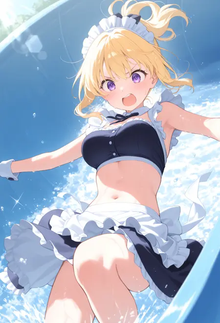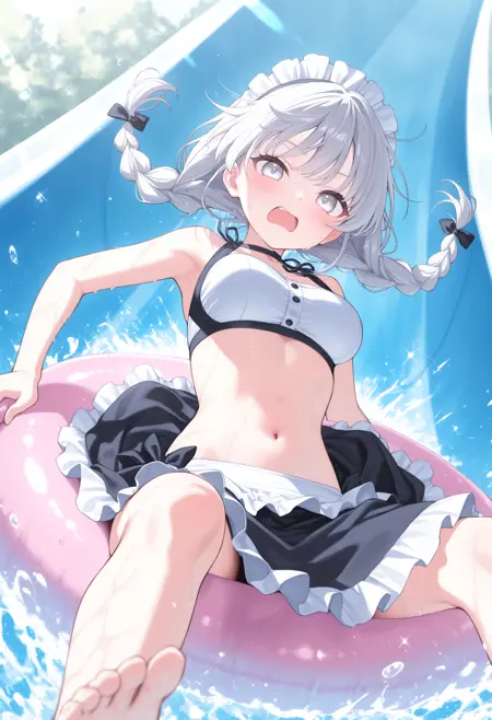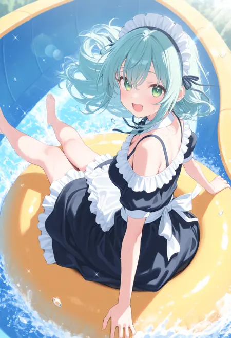 트리거만으로는 움직임이 거의 없으므로, 다음 항목 중 필요한 요소를 추가해 주세요: water, splashing, water drop, sweatdrop, wet, wet hair, wet clothes, floating hair, open mouth, day, outdoors, sparkle, lens flare, sunlight. 아무것도 추가하지 않으면 일반적으로 엉덩이로 미끄러지지만, 플로트에 앉히고 싶다면 swim ring, innertube, sitting을 추가하면 일반적으로 앉을 수 있습니다.