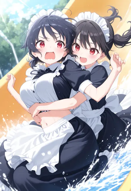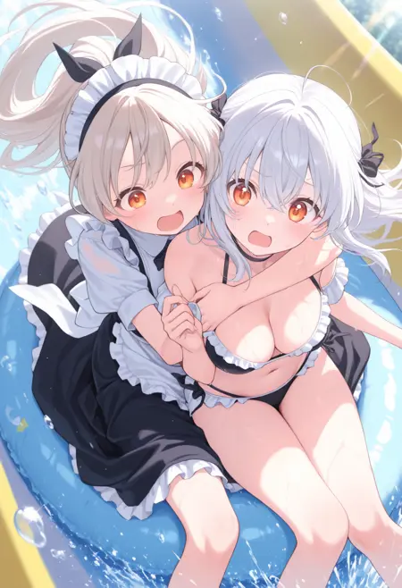 トリガーだけだとあまり動きがないので water, splashing, water drop, sweatdrop, wet,wet hair, wet clothes, floating hair, open mouth, day,outdoors, sparkle, lens flare, sunlight 辺りから必要なものを入れて下さい。何も入れなければ大体お尻で滑りますが浮き輪に乗せたい場合は swim ring, innertube, sitting を入れれば大体乗ります。