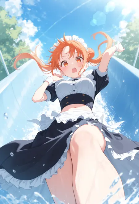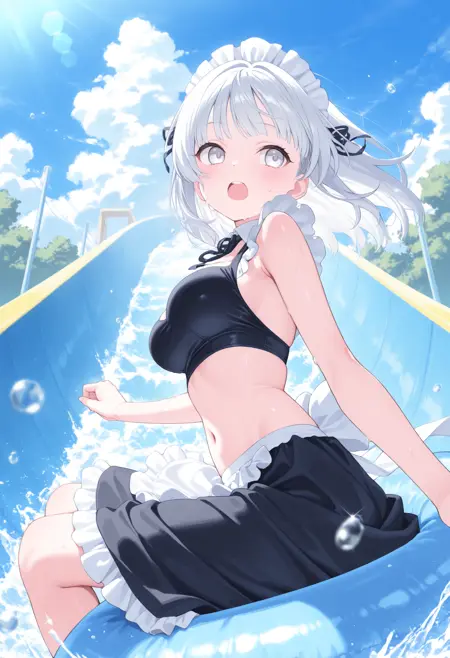 Since the trigger alone doesn't produce much movement, please add necessary elements from the following list: water, splashing, water drop, sweatdrop, wet, wet hair, wet clothes, floating hair, open mouth, day, outdoors, sparkle, lens flare, sunlight. If nothing is added, it will generally slide on its butt, but if you want it to ride a float, adding swim ring, innertube, sitting will generally make it ride.