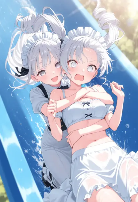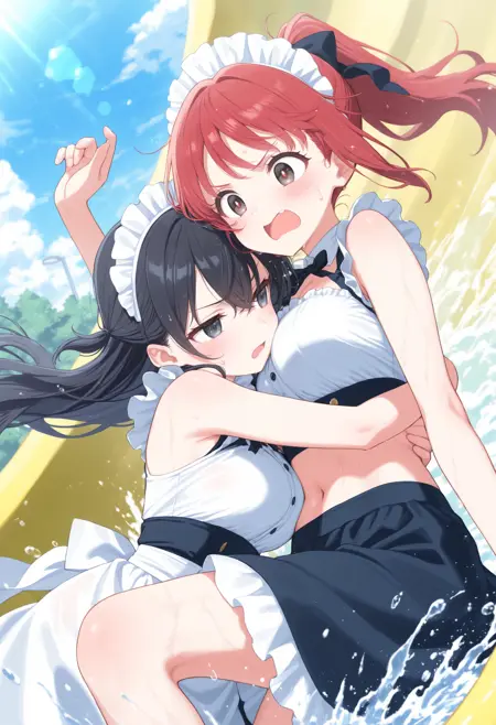 Since the trigger alone doesn't produce much movement, please add necessary elements from the following list: water, splashing, water drop, sweatdrop, wet, wet hair, wet clothes, floating hair, open mouth, day, outdoors, sparkle, lens flare, sunlight. If nothing is added, it will generally slide on its butt, but if you want it to ride a float, adding swim ring, innertube, sitting will generally make it ride.
