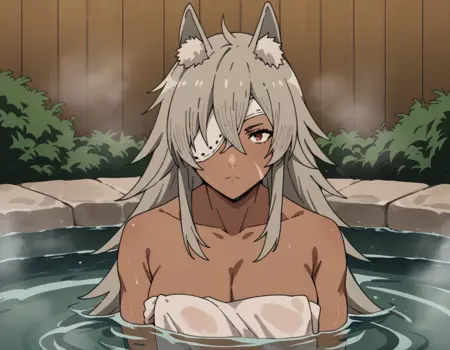 ghislaine dedoldia、長い髪、前髪、赤い目、動物の耳、目の間の髪、灰色の髪、横髪、猫の耳、黒い肌、黒肌の女性、動物の耳のふわふわ、顔の傷跡、頬の傷跡、