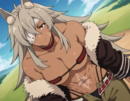 長袖、へそ、胸元、肩出し、下着、鎖骨、パンティー、ジャケット、チョーカー、ベルト、パンツ、肩出し、黒いジャケット、ファーのフリンジ、黒いパンティー、ストラップレス、筋肉質、アンダーブース、ハイレグ、アイパッチ、腹筋、ブライダルガントレット、筋肉質の女性、ハイレグパンティー、ファーのフリンジ付きジャケット、赤いチョーカー、緑のパンツ、開いたパンツ、開いたベルト、お腹の傷跡