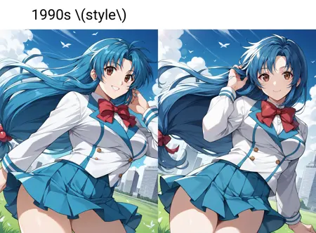 그림 스타일은 "1990s(style)"을 포함하거나 제외하여 변경할 수 있습니다. 그러나 이상하게도 머리스타일도 변경됩니다. AI는 흥미롭습니다.