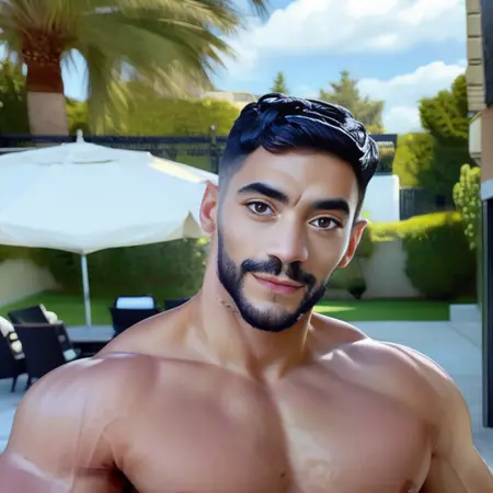 Other recommended tags that tend to help (mix and match): solo, arm tattoo, short hair, black hair, facial hair, beard, undercut, bara, mature male, 1boy, nipples, pectorals, upper body, male focus, nude, briefs, underwear, navel, navel hair, shirtless