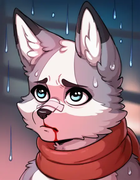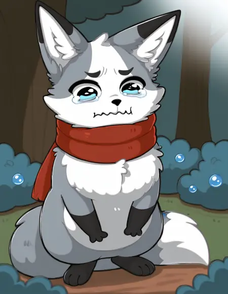프롬프트: Rainey, gray fur, two tone fur, red scarf, fox tail, black paws, 3 fingers.