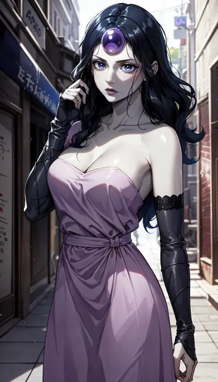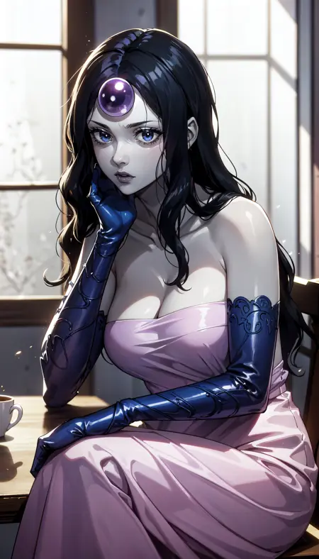 (灰色皮肤:1.5), (苍白皮肤:1.5), 长发, 黑发, 紫色眼睛, 紫色睡裙, 无肩带连衣裙, (蓝色长手套), 额头大宝石, 怪物