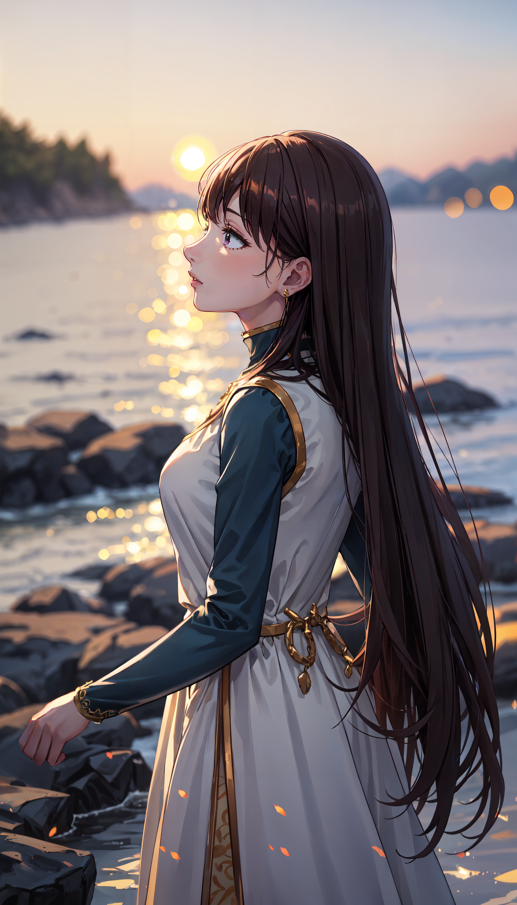 长发, 棕发, 紫色眼睛, 长裙, 黄色裙子, 长袖, 绿色袖子