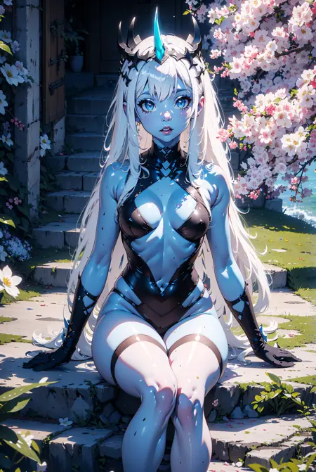 必要的触发词: princess001def, small breasts, blue horns, blue skin, long hair, single horn,