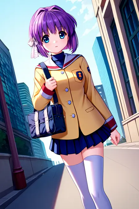 yellow uniform, clannad uniform, blue skirt, white stockings