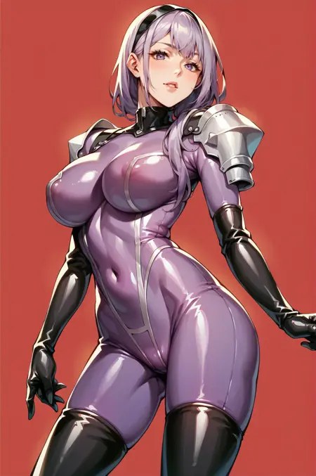latex bodysuit,purple bodysuit,shoulder armor,elbow gloves,thigh boots
