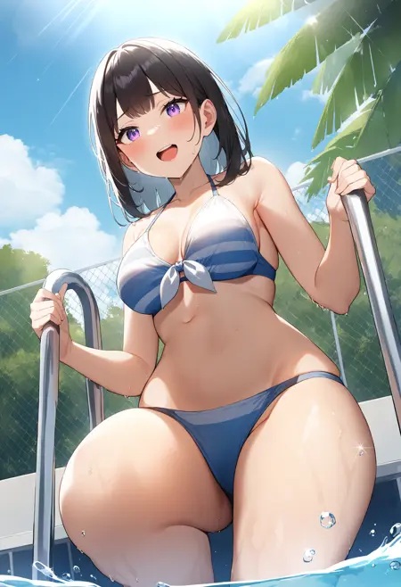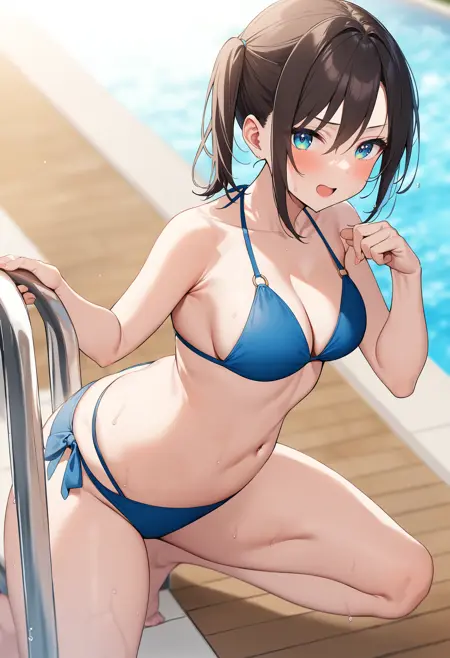 原本Illustrious仅靠提示词即可生成此姿势,但难以稳定抓住梯子,因此我们进行了优化使其更稳定。仅使用触发词也可使用,但若加入“pool”、“wet”、“water”、“poolside”、“outdoors”、“climbing”、“wet hair”、“water drop”等词,角色的上下梯动作会更自然。若想看到从泳池中爬出的臀部,可加入“from below”或“from behind”。