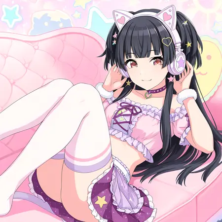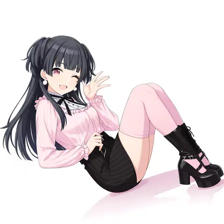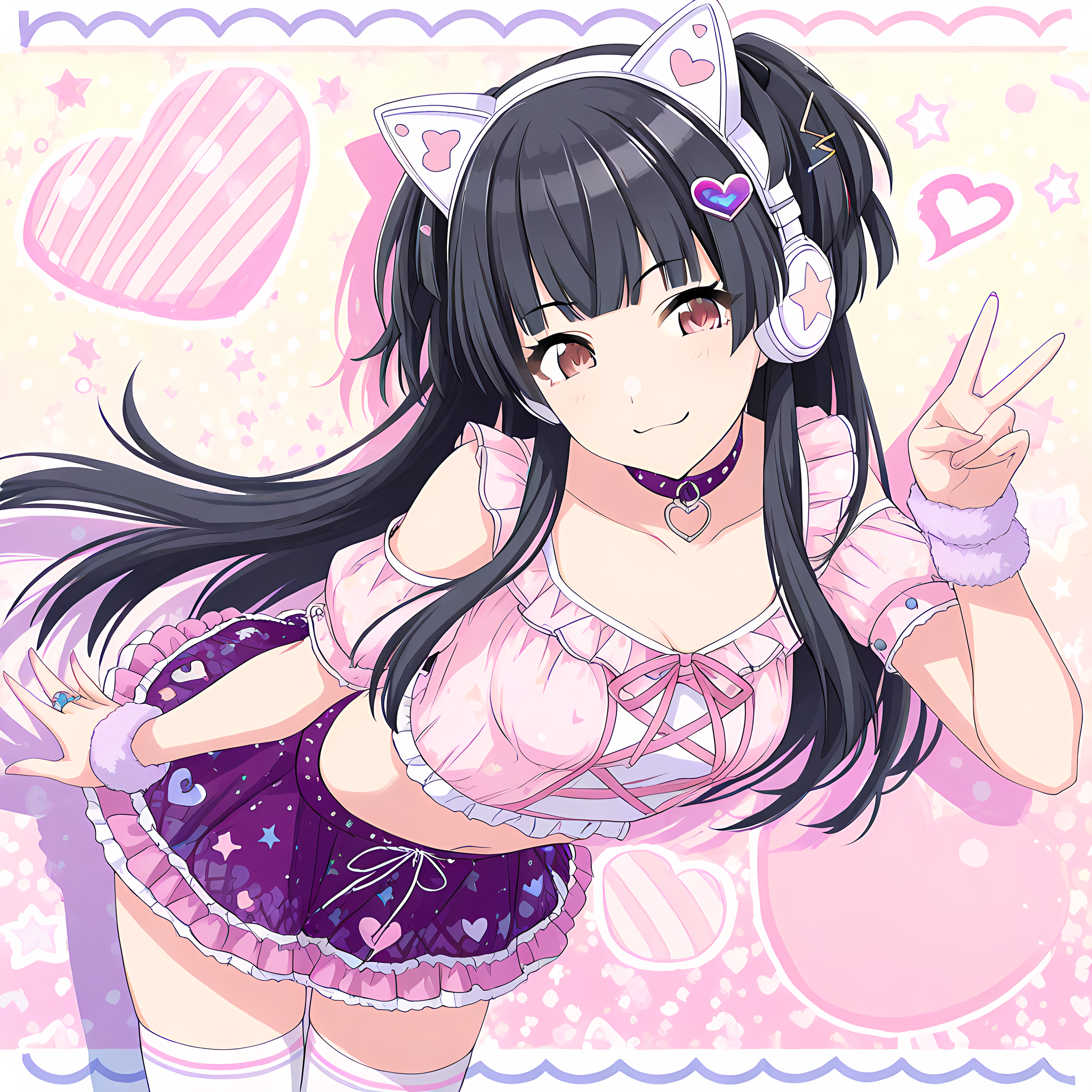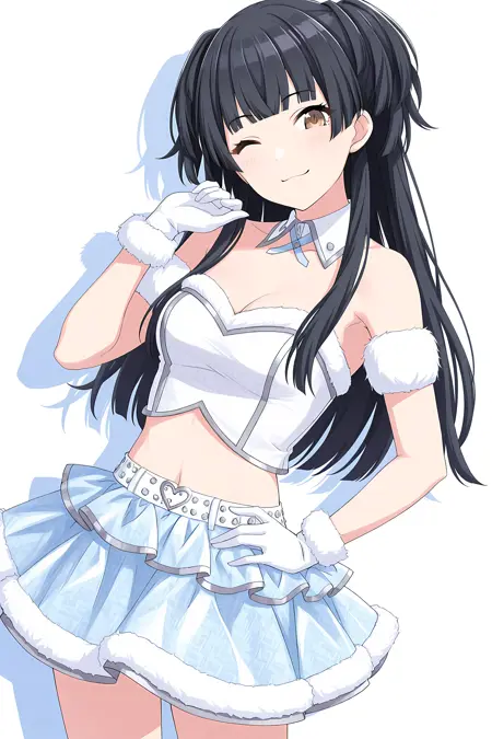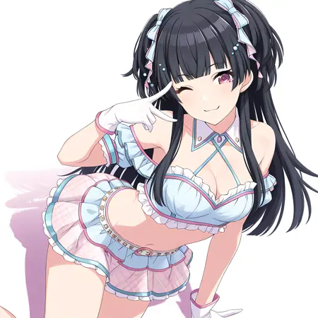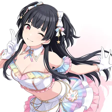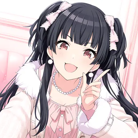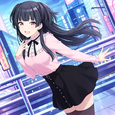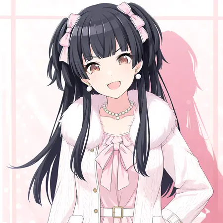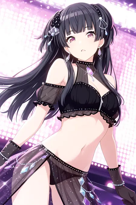 IllustriousXL 태그: "mayuzumi_fuyuko, 1girl, gloves, black hair, two side up, brown eyes, small breasts" — 조명이 어두울 때는 "pink eyes"로 교차 적용.
